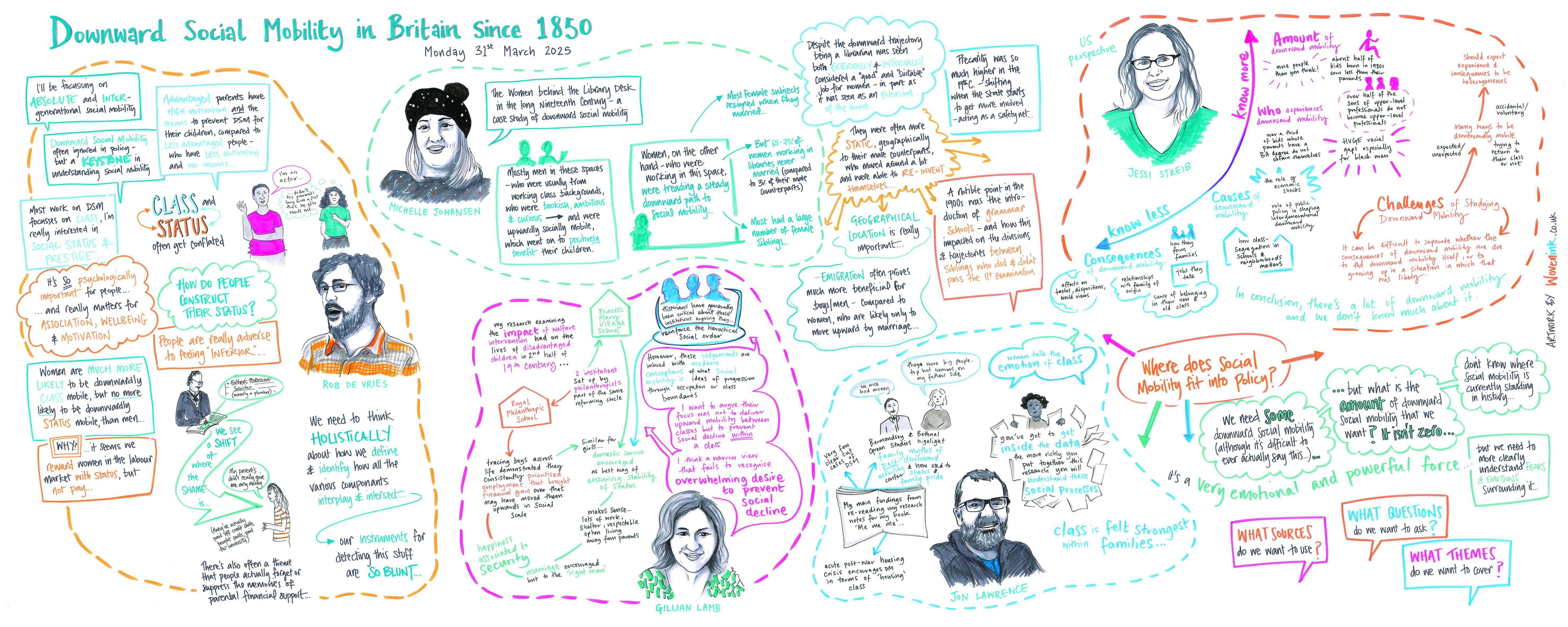 The project was launched with a workshop held at Exeter College which brought together scholars from across the Humanities and Social Sciences to explore and define what we mean by downward social mobility, and how historical sources and methodologies can help us develop a clearer understanding of this often sensitive subject. The discussion was captured in ‘Visual Minutes’ produced by Woven Ink which will be used to solicit feedback on academic perspectives from potential project partners among those working with those experiencing downward social mobility.